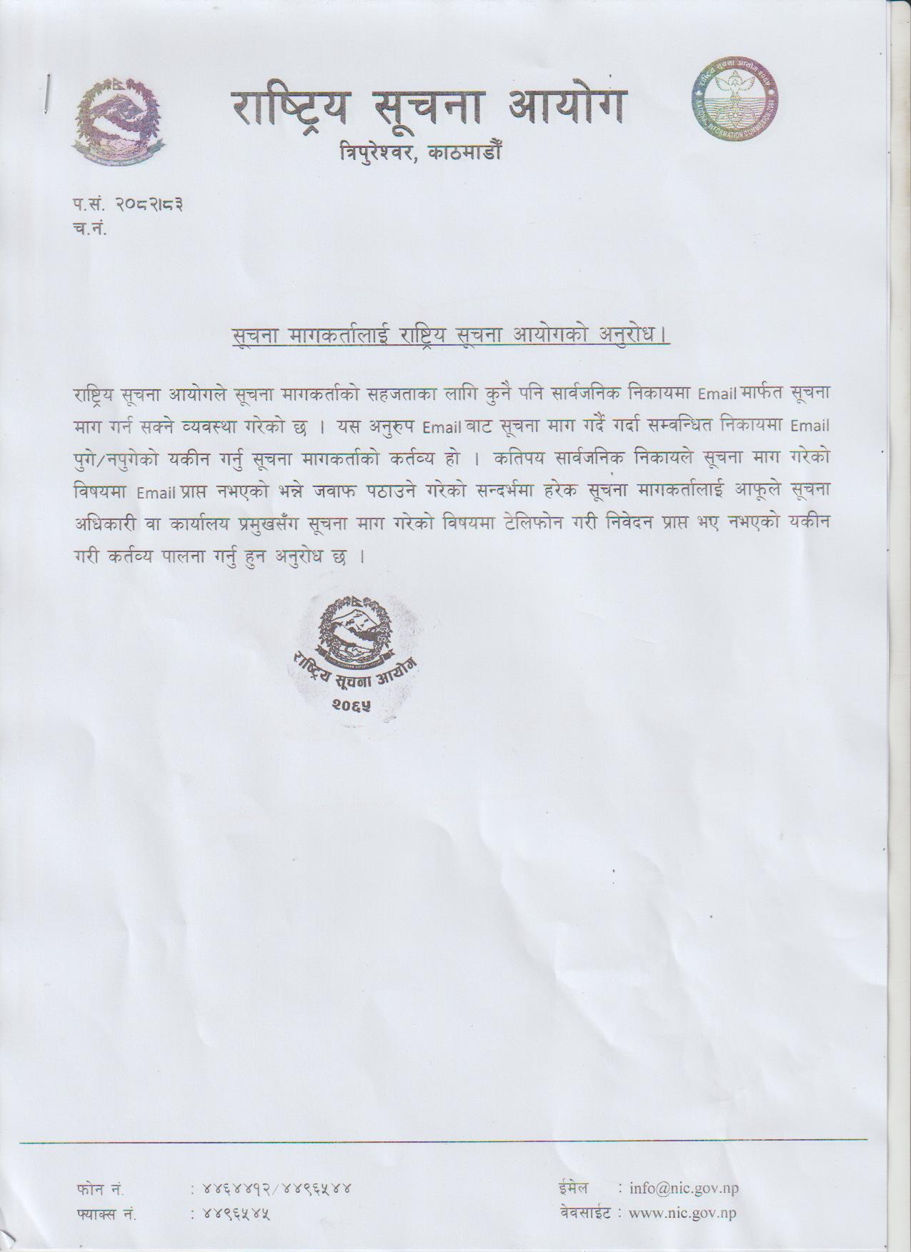 appeal@nic.gov.np पुनरावेदन शाखासँग सम्बन्धित इमेलको लागि छुट्टैappeal@nic.gov.np को व्यवस्था गरिएको व्यहोरा अनुरोध छ ।