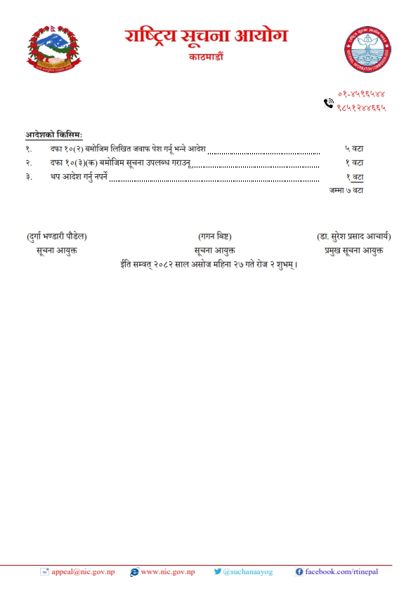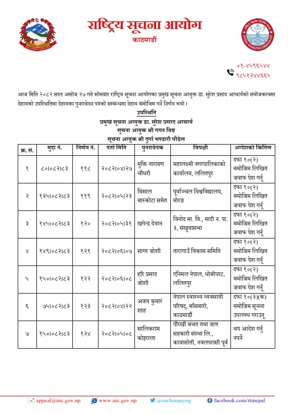 appeal@nic.gov.np पुनरावेदन शाखासँग सम्बन्धित इमेलको लागि छुट्टैappeal@nic.gov.np को व्यवस्था गरिएको व्यहोरा अनुरोध छ ।